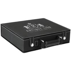 Leatherette offers the look and feel of genuine leather at a fraction of the price. This richly textured, synthetic material is water resistant, easy to clean and durable enough for the rigors of daily use. The poker set includes 100 commercial grade chips (not laserable), 2 decks of cards, and 5 dice. The inside of the box has black, felt lining. The poker set has a handle and 2 snaps for closure. Laser Engraved leaving an elegant silver imprint color. Individually packaged.