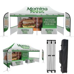 Are you attending an event and need a booth? This package covers everything you need to showcase your brand! This custom tent package features a 10' x 20' canopy tent (including the frame, print top and roller bag), a 20 ft. single-sided back wall, two 10 ft. single-sided half walls, two 9' double-sided flags with a cross base and pole kits for each, and two 6 ft. table throw. Display your company name, logo, event title, organizational slogan and more, as all items come with full color dye sublimation printing!