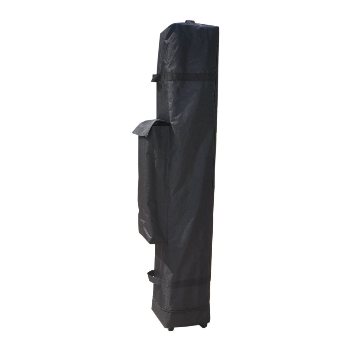 Includes: 10' x 10' canopy with frame, roof, back wall, 2 side half-walls, table cover and a roller bag.