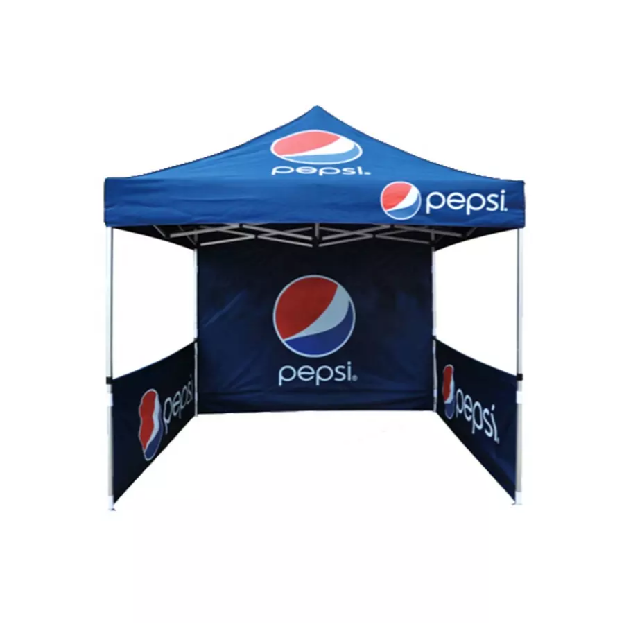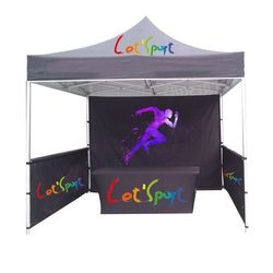 This outdoor Canopy Tent With Customized Logo available. Canopy tent includes a 10' x 10' Tent Top, 10' Full Digital Back Wall, Pair of Half-wall Full Digital Skirts, Tablecloth Full Digital and frame. Custom digital dye sublimated printed on 600D polyester tent top,back wall,half wall or tablecloth. The canopy is not only waterproof, but also UV-inhibited and fire retardant. With a roller bag easy to package the tent and easy to carry. Our custom printed pop up canopies and tents are perfect for advertising. Pop Up Shelter, Festival Tent, Party Canopy Tent, Instant Shade Canopy, Portable Canopy Tent.
