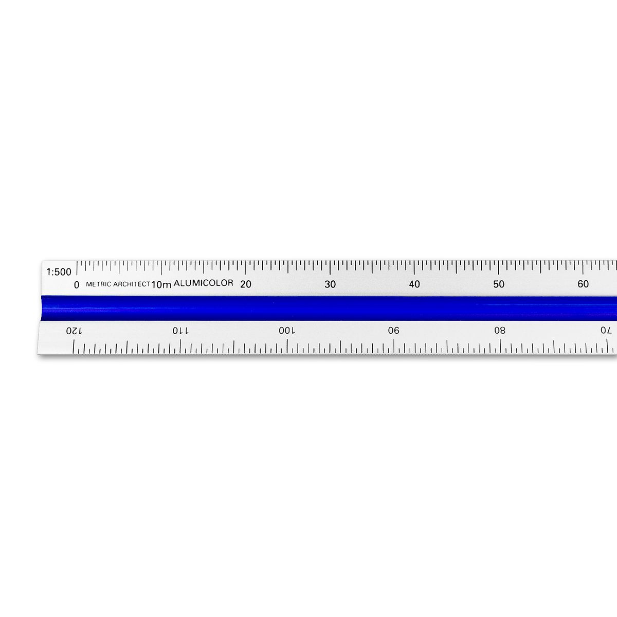 Aluminum 30 cm color coded metric architect solid triangular scale is made from high quality extruded aluminum with ultra smooth edges and photo anodized calibrations making them a permanent part of the aluminum that will never wear or rub off. Calibrations are 1:100, 1:200, 1:250, 1:300, 1:400 and 1:500.